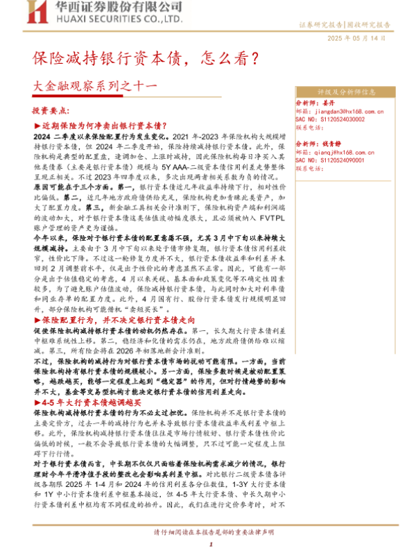 【华西证券】【20250514】大金融观察系列之十一:保险减持银行资本债,怎么看?-16页 证券期货研究报告