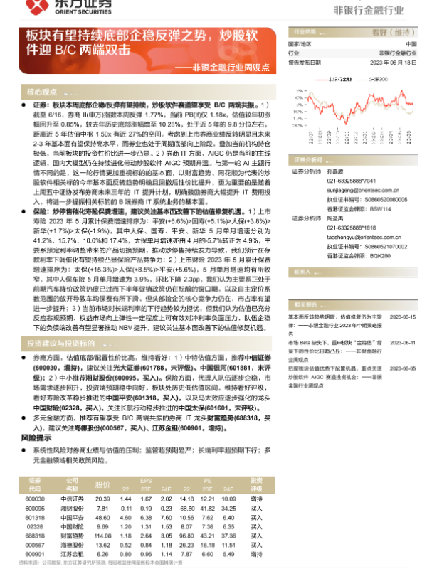 【东方证券】【20230618】非银金融行业周观点:板块有望持续底部企稳反弹之势,炒股软件迎B C两端双击-14页 行业研究