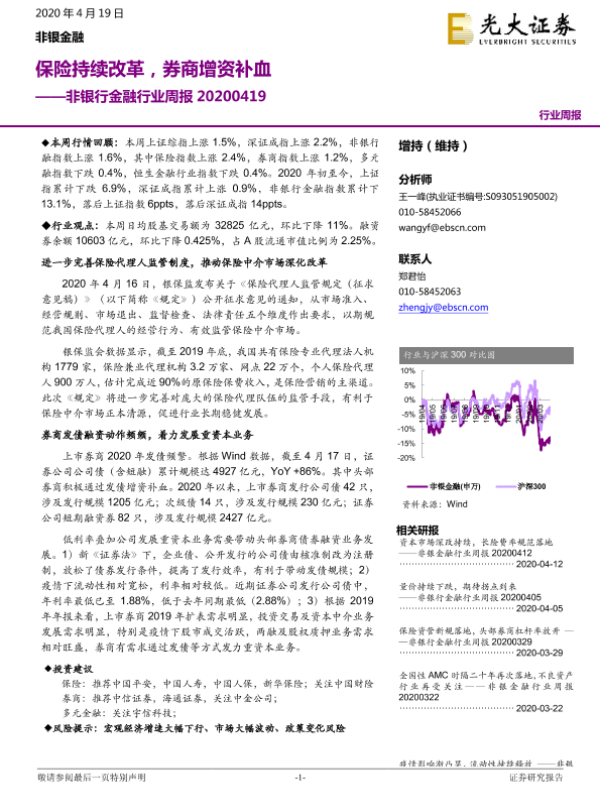 【光大证券】【20200419】非银行金融行业周报:保险持续改革,券商增资补血-15页 行业研究