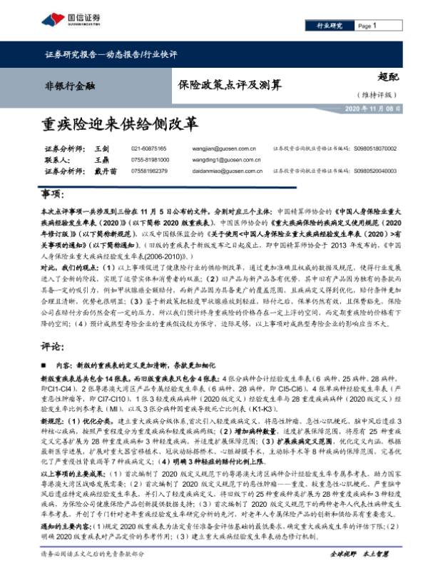 【国信证券】【20201108】非银金融保险政策点评及测算:重疾险迎来供给侧改革-6页 行业研究