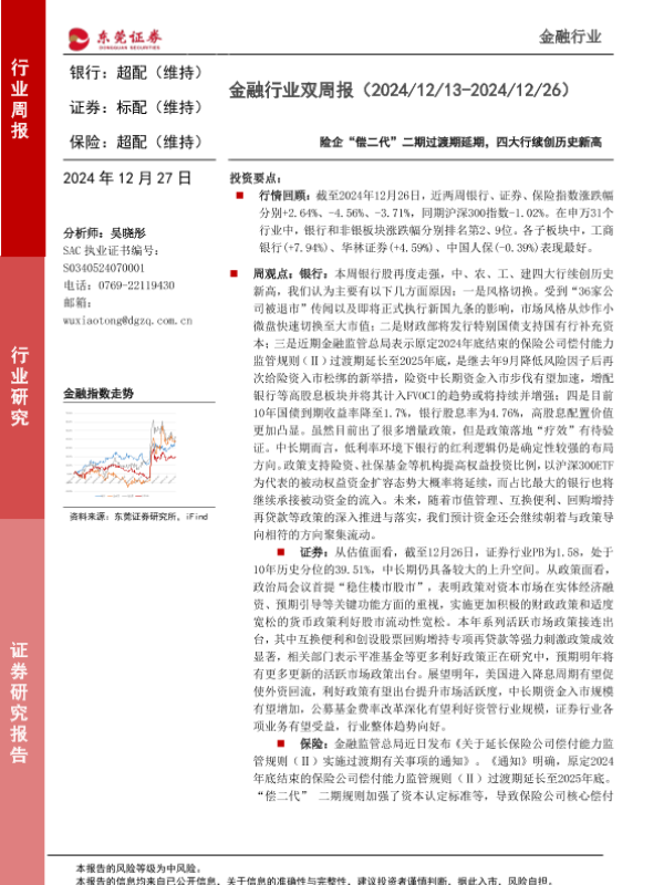 【东莞证券】【20241227】金融行业双周报:险企“偿二代”二期过渡期延期,四大行续创历史新高-14页 行业研究