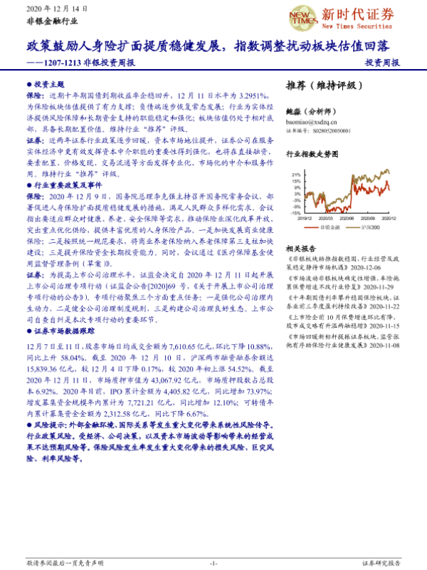 【新时代证券】【20201214】非银投资周报:政策鼓励人身险扩面提质稳健发展,指数调整扰动板块估值回落-11页 行业研究
