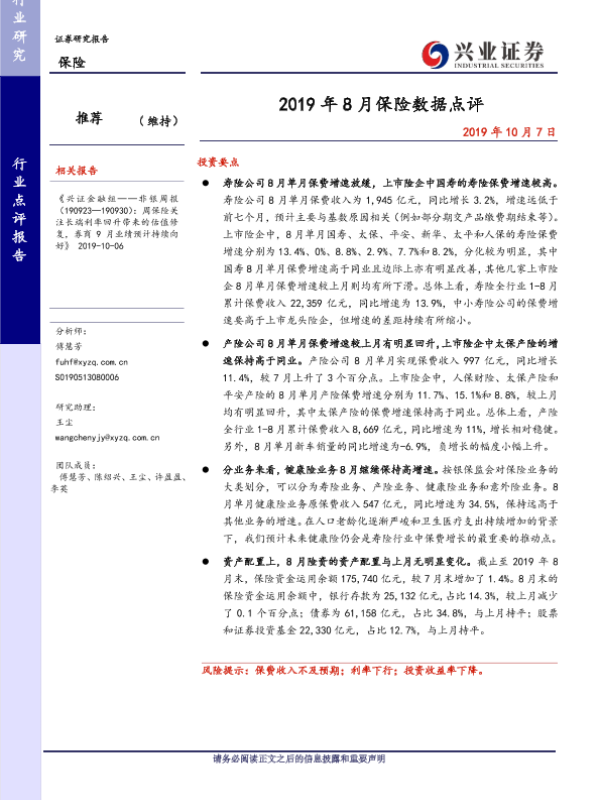 【兴业证券】【20191007】2019年8月保险数据点评-6页 行业研究