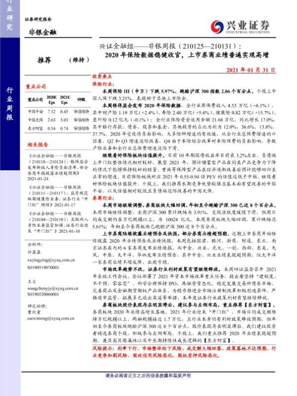 【兴业证券】【20210131】非银周报:2020年保险数据稳健收官,上市券商业绩普遍实现高增-11页 行业研究