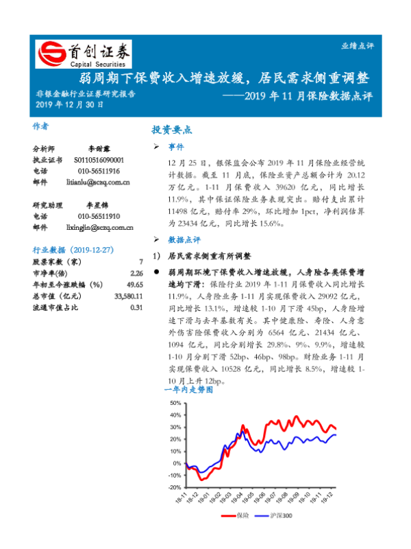 【首创证券】【20191230】2019年11月保险数据点评:弱周期下保费收入增速放缓,居民需求侧重调整-6页 行业研究
