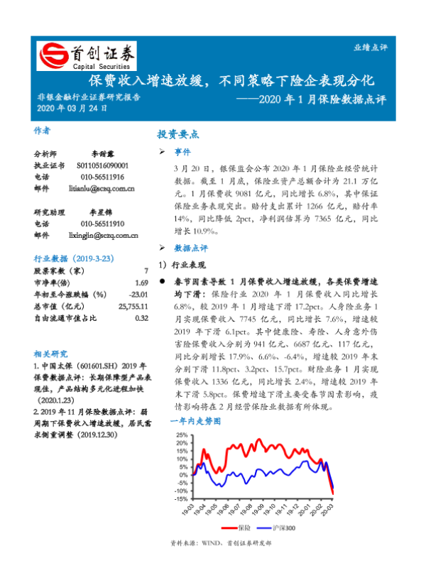【首创证券】【20200324】2020年1月保险数据点评:保费收入增速放缓,不同策略下险企表现分化-6页 行业研究