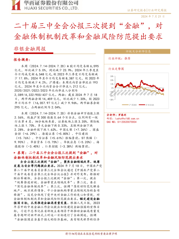 【华西证券】【20240721】非银金融周报:二十届三中全会公报三次提到“金融”,对金融体制机制改革和金融风险防范提出要求-13页 行业研究