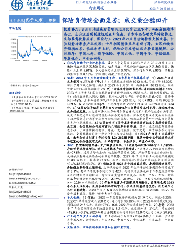 【海通证券】【20230906】综合金融服务行业周报:保险负债端全面复苏;成交量企稳回升-12页 行业研究
