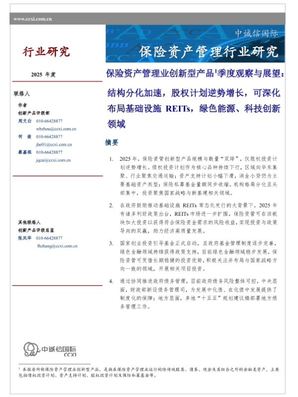 【中诚信国际】【2025】保险资产管理业创新型产品1季度观察与展望:结构分化加速,股权计划逆势增长,可深化布局基础设施 REITs,绿色能源、科技创新领域-13页 行业研究