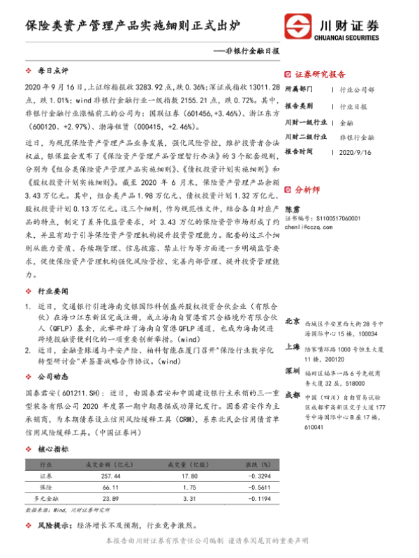 【川财证券】【20200916】非银行金融日报:保险类资产管理产品实施细则正式出炉-2页 证券期货研究报告