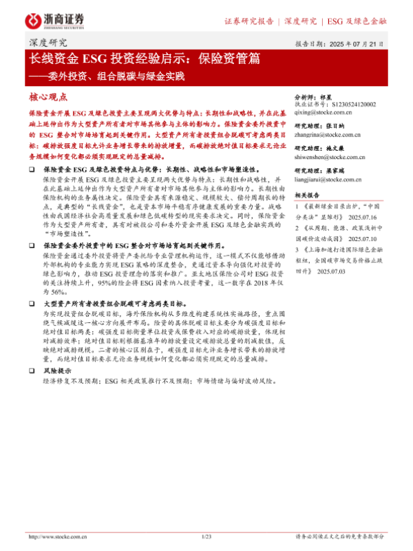 【浙商证券】【20250721】委外投资、组合脱碳与绿金实践:长线资金ESG投资经验启示-23页 证券期货研究报告
