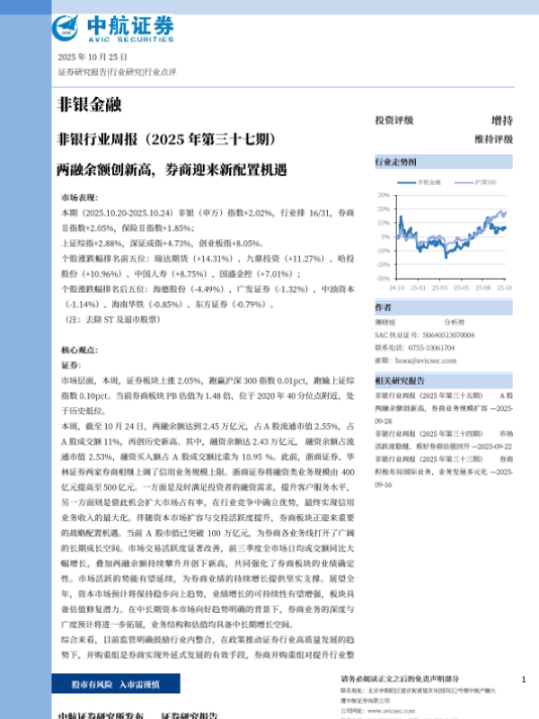 【中航证券】【202510】非银行业周报(2025年第三十七期):两融余额创新高,券商迎来新配置机遇-10页 证券期货研究报告