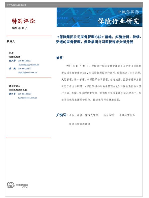 【中诚信国际】【202112】保险集团公司监督管理办法落地,实施全面、持续、穿透的监督管理,保险集团公司监管迎来全面升级-5页 行业研究