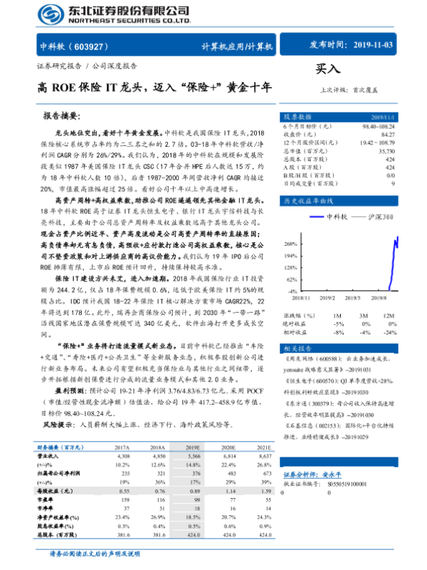 【东北证券】【20191103】高ROE保险IT龙头,迈入“保险+”黄金十年-57页 行业研究