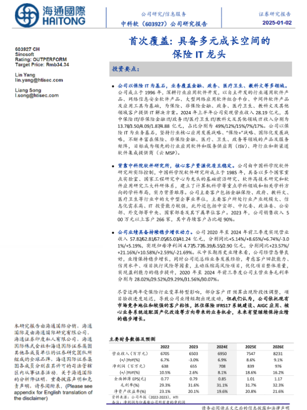 【海通国际】【20250102】中科软(603927)首次覆盖:具备多元成长空间的保险IT龙头-14页 行业研究