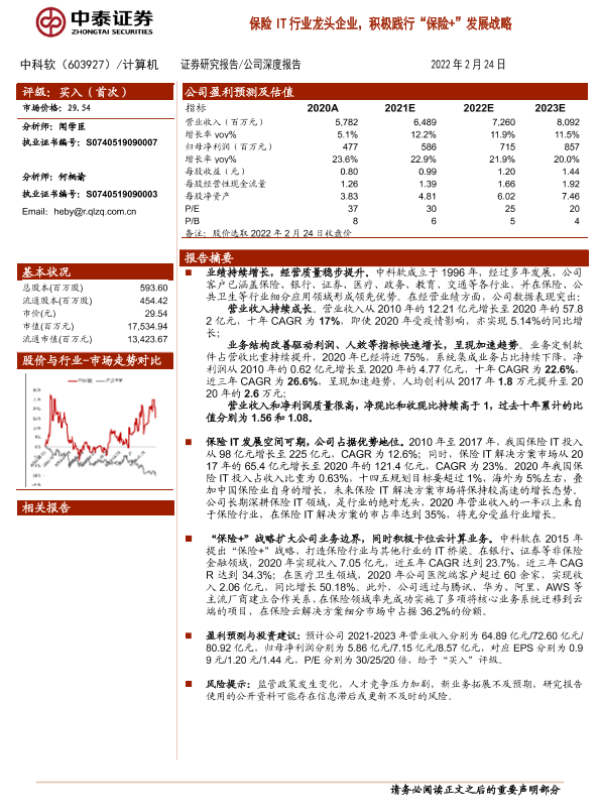 【中泰证券】【20220224】中泰证券-中科软-603927.SH-保险IT行业龙头企业,积极践行“保险+”发展战略-32页 行业研究