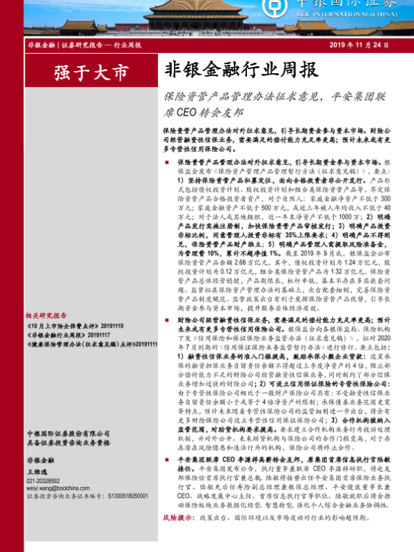 【中银证券】【20191124】非银金融行业周报:保险资管产品管理办法征求意见,平安集团联席CEO转会友邦-13页 行业研究