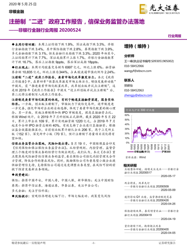 【光大证券】【20200525】非银行金融行业周报:注册制“二进”政府工作报告,信保业务监管办法落地-20页 行业研究
