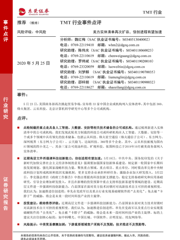 【东莞证券】【20200525】TMT行业事件点评:美方实体清单再次扩容,信创进程有望加速-2页 行业研究