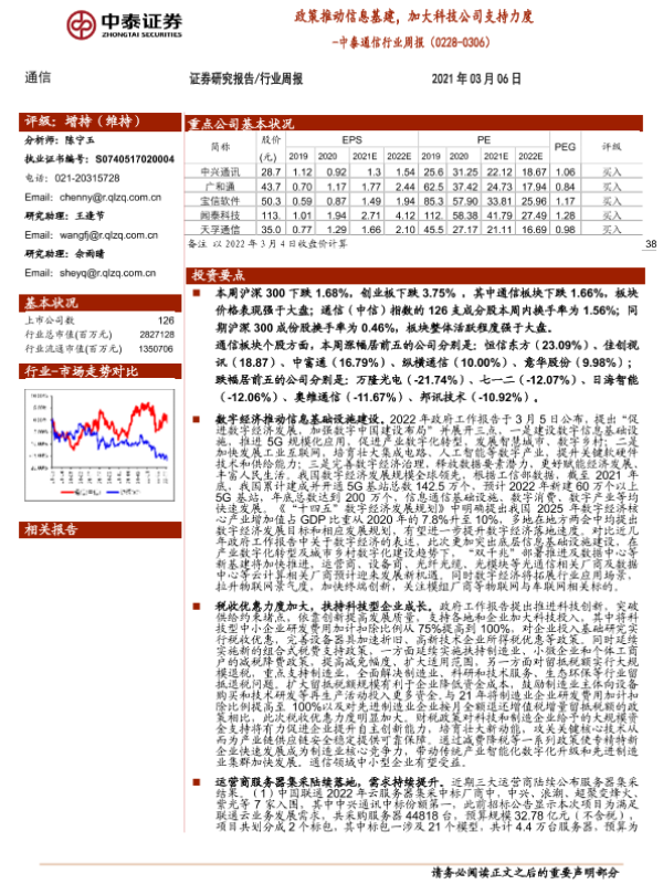 【中泰证券】【20220306】中泰通信行业周报:政策推动信息基建,加大科技公司支持力度-19页 行业研究