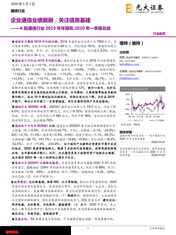 【光大证券】【20200503】A股通信行业2019年年报和2020年一季报总结:企业通信业绩靓丽,关注信息基建-14页 行业研究
