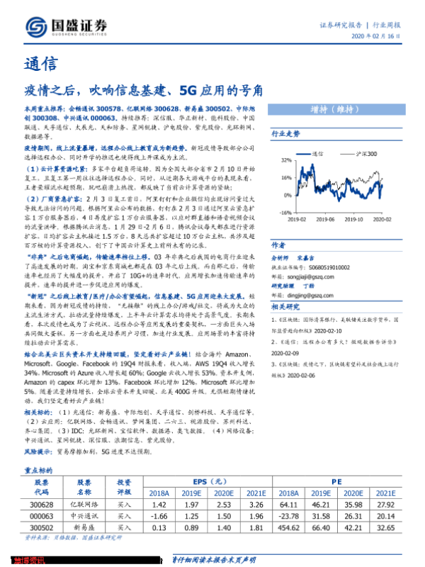【国盛证券】【20200216】通信行业周报:疫情之后,吹响信息基建、5G应用的号角-10页 行业研究