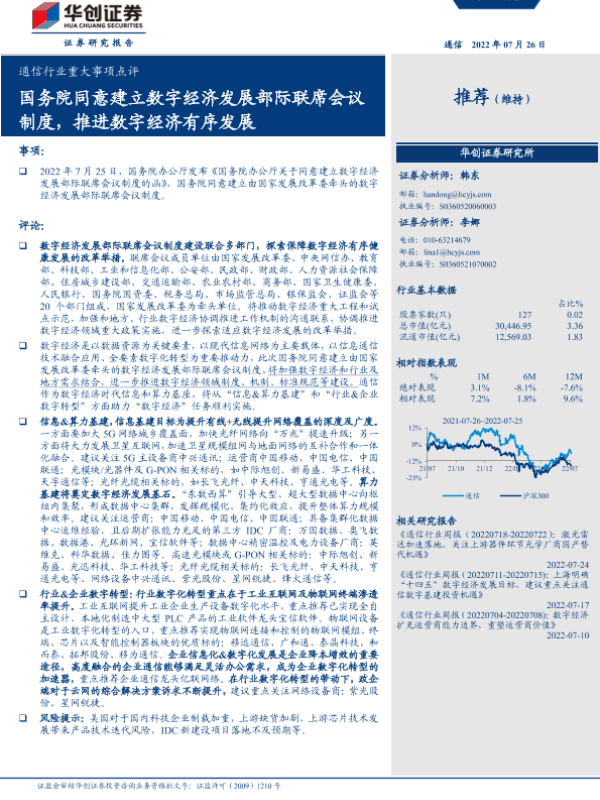 【华创证券】【20220726】通信行业重大事项点评:国务院同意建立数字经济发展部际联席会议制度,推进数字经济有序发展-4页 行业研究