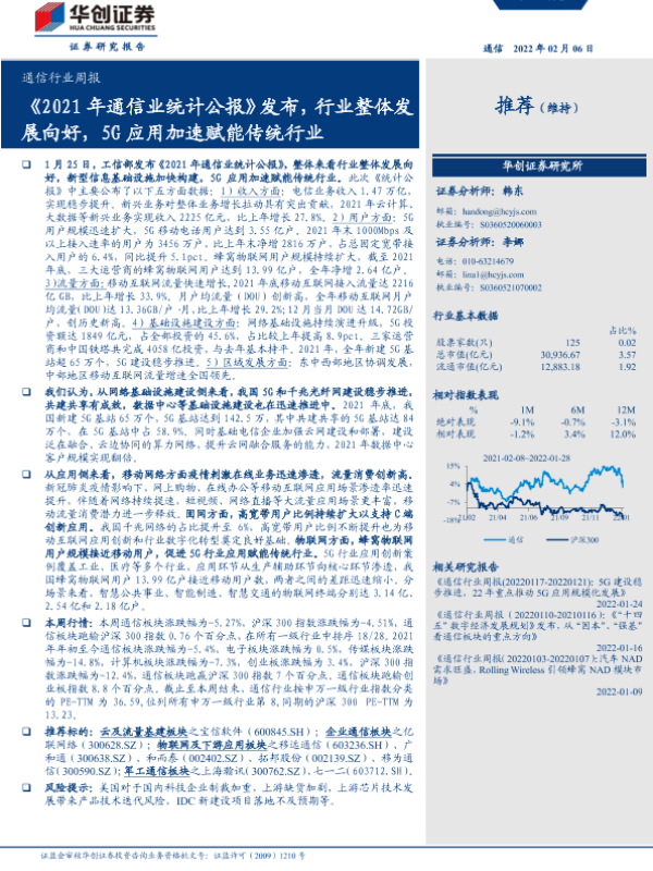 【华创证券】【20220206】20220206-华创证券-通信行业周报:《2021年通信业统计公报》发布,行业整体发展向好,5G应用加速赋能传统行业-19页 行业研究