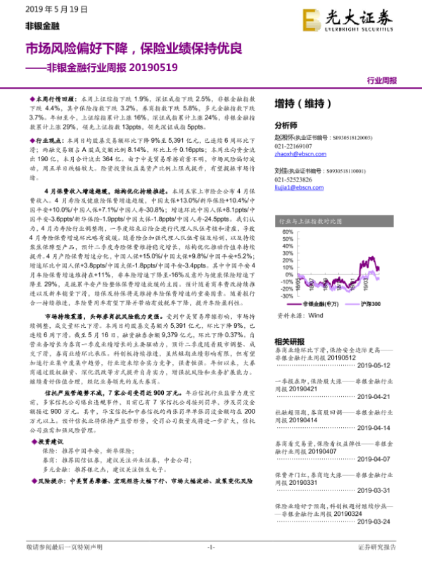 【光大证券】【20190519】非银金融行业周报:市场风险偏好下降,保险业绩保持优良-15页 行业研究