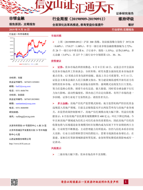 【山西证券】【20190916】非银金融行业周报:全面深化改革再推进,券商受益估值提升-7页 行业研究