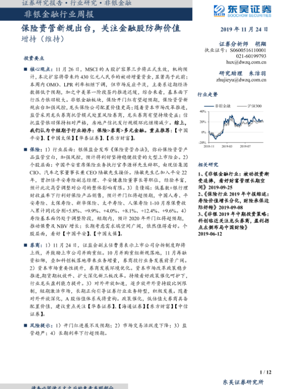 【东吴证券】【20191124】非银金融行业周报:保险资管新规出台,关注金融股防御价值-12页 行业研究