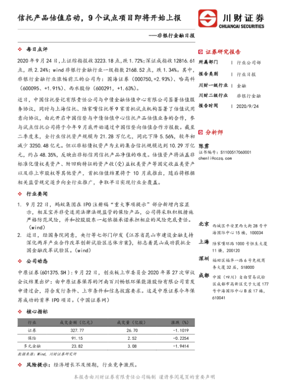 【川财证券】【20200924】非银行金融日报:信托产品估值启动,9个试点项目即将开始上报-2页 证券期货研究报告