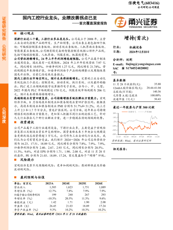【甬兴证券】【20241203】信捷电气(603416)首次覆盖深度报告:国内工控行业龙头,业绩改善拐点已至-22页 行业研究