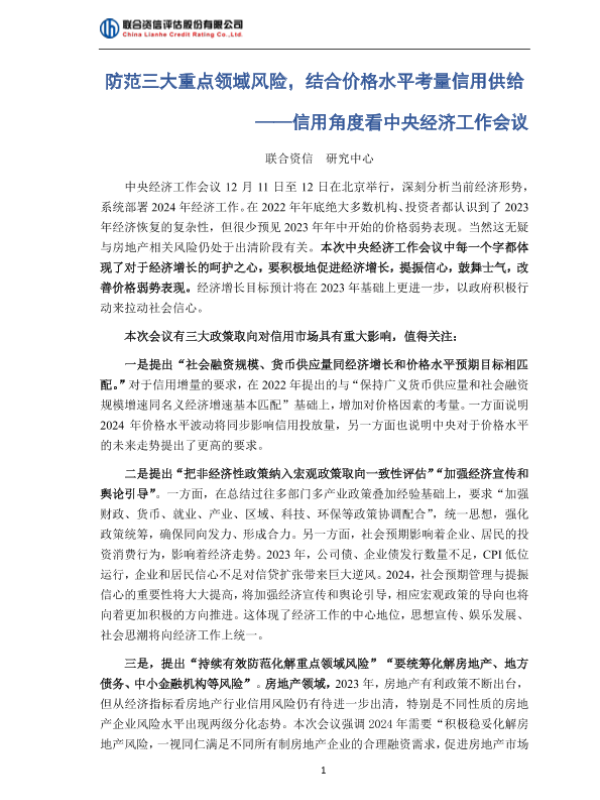 【联合资信】【2023】防范三大重点领域风险,结合价格水平考量信用供给——信用角度看中央经济工作会议-4页 宏观策略