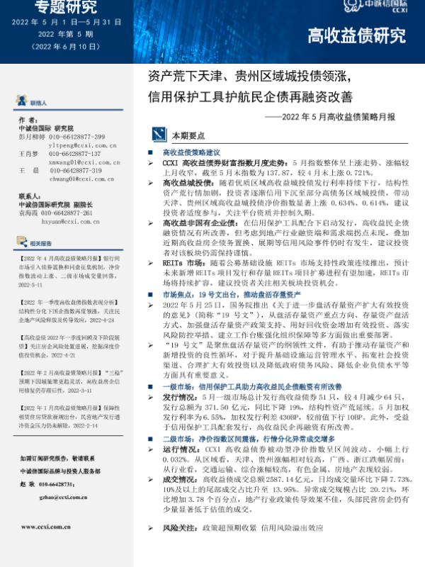 【中诚信国际】【202205】中诚信-2022年5月高收益债策略月报:资产荒下天津、贵州区域城投债领涨,信用保护工具护航民企债再融资改善-15页 行业研究
