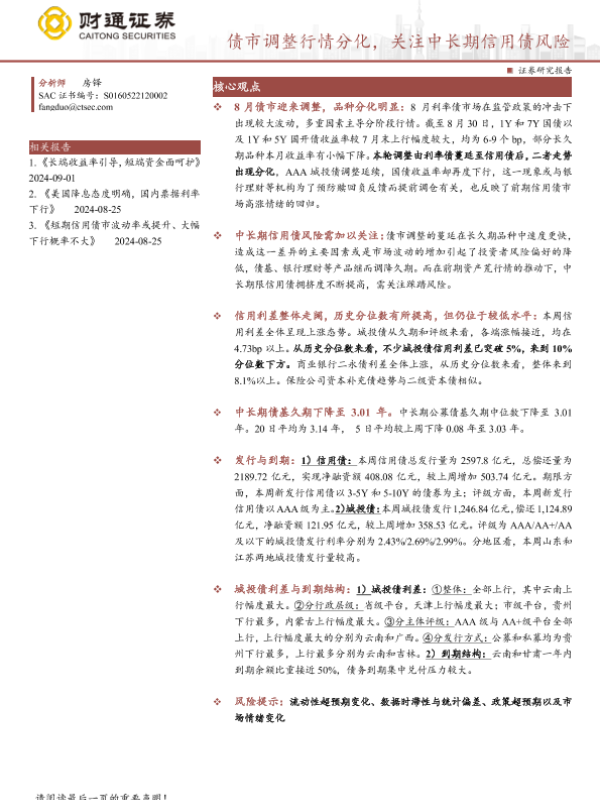 【财通证券】【20240902】债市调整行情分化,关注中长期信用债风险-18页 行业研究