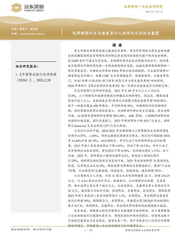 【远东资信】【202603】化学制药行业与债券发行人信用状况分析及展望-19页 行业研究