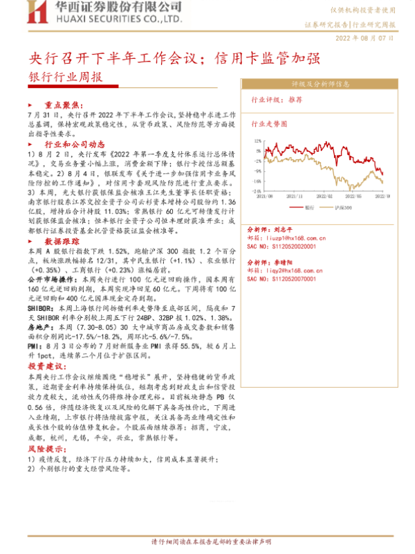 【华西证券】【20220807】银行行业周报:央行召开下半年工作会议;信用卡监管加强-9页 行业研究