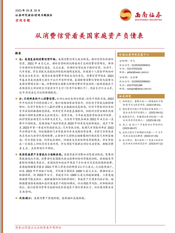 【西南证券】【20230928】从消费信贷看美国家庭资产负债表-15页 行业研究