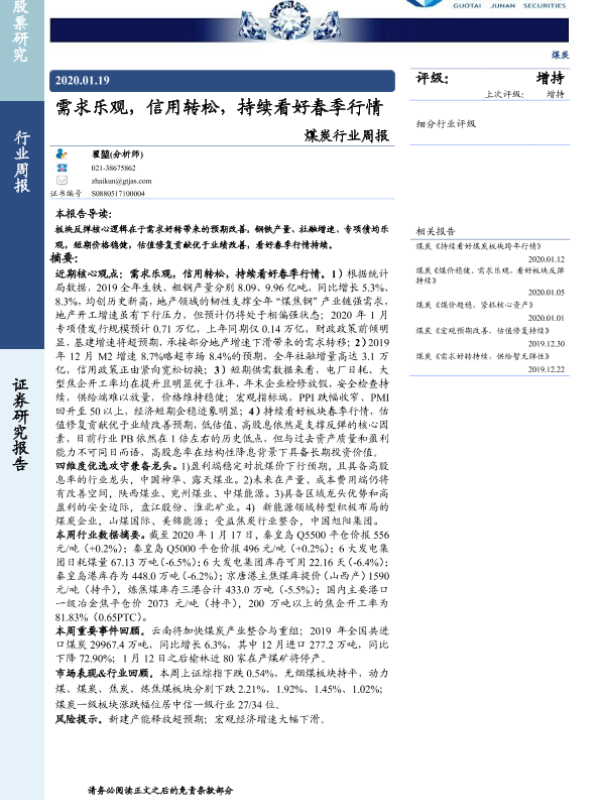 【国泰君安证券】【20200119】20200119-国泰君安-煤炭行业周报:需求乐观,信用转松,持续看好春季行情-18页 行业研究
