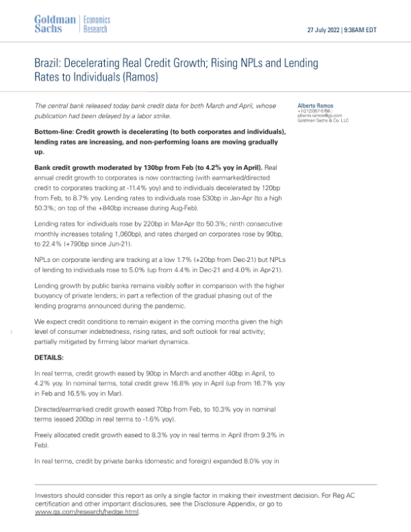 【Goldman Sachs】【20220727】Real Credit Growth; Rising NPLs and Lending Rates to Individuals-6页 行业研究
