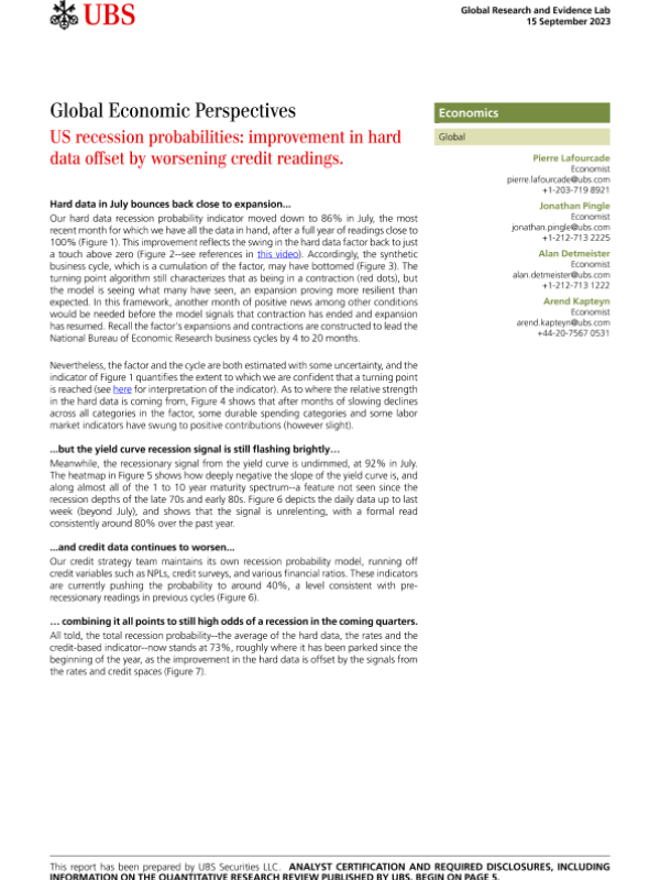【UBS Securities LLC】【20230915】Global Economic Perspectives US recession probabilities improvement in hard data offset by worsening credit readings-8页 宏观策略