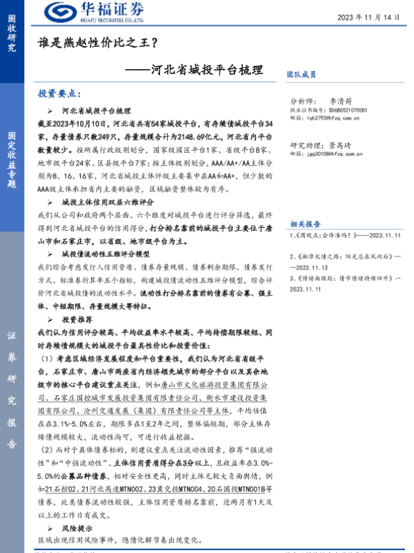 【华福证券】【20231114】河北省城投平台梳理:谁是燕赵性价比之王?-36页 行业研究