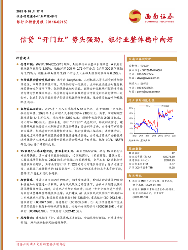 【西南证券】【20250217】银行业投资月报:信贷“开门红”势头强劲,银行业整体稳中向好-28页 行业研究