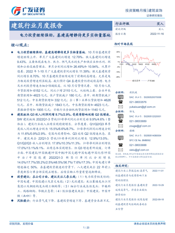 【广发证券】【20221116】建筑行业月度报告:电力投资继续强劲,基建高增静待更多实物量落地-23页 行业研究