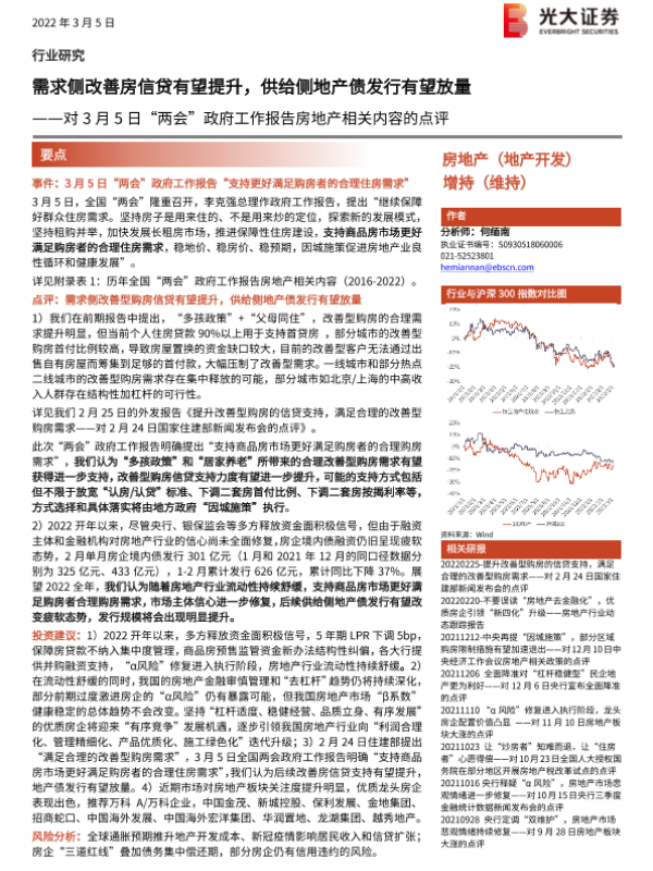 【光大证券】【20220305】对3月5日“两会”政府工作报告房地产相关内容的点评-3页 行业研究