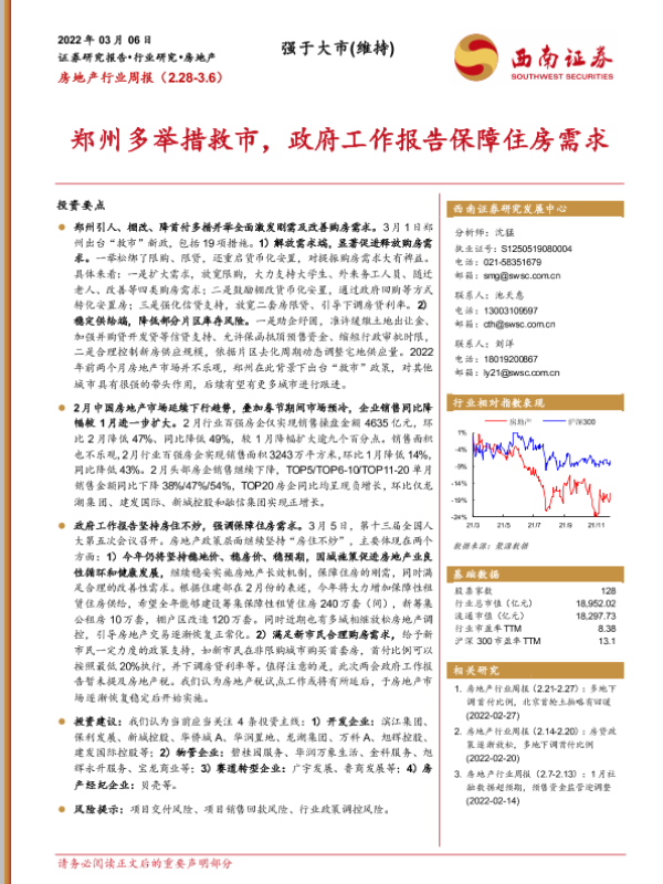 【西南证券】【20220306】房地产行业周报:郑州多举措救市,政府工作报告保障住房需求-15页 行业研究