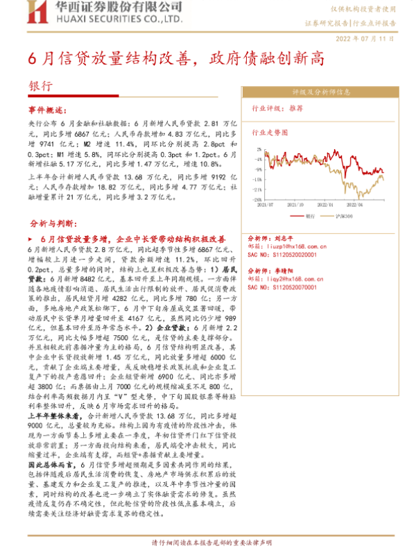 【华西证券】【20220711】6月信贷放量结构改善,政府债融创新高-4页 行业研究