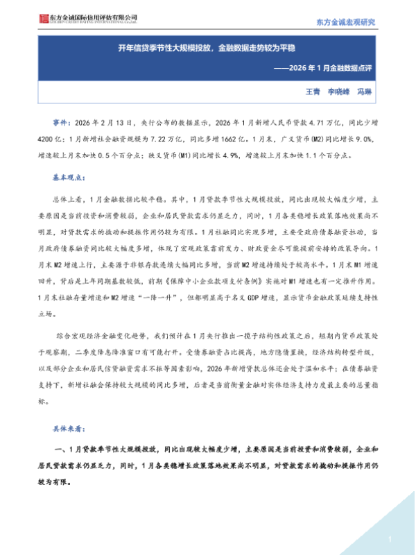 【东方金诚】【202602】开年信贷季节性大规模投放,金融数据走势较为平稳——2026年 1月金融数据点评-4页 宏观策略