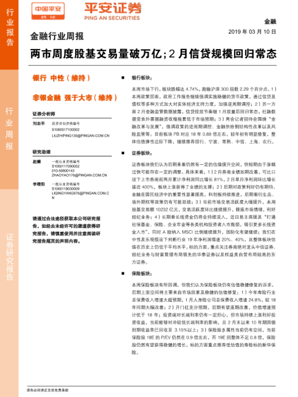 【平安证券】【20190310】两市周度股基交易量破万亿;2月信贷规模回归常态-10页 行业研究
